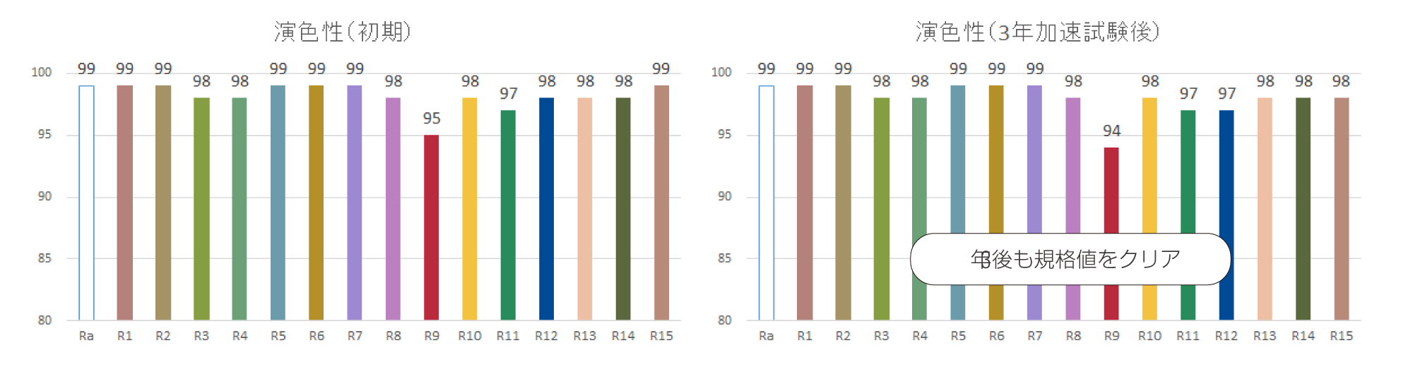 JIS Z 9112 演色AAA、日本印刷学会規格(JSPST-1998)に準拠する演色性を備えています。経年劣化を想定した試験においても、安定した色味を表現します。